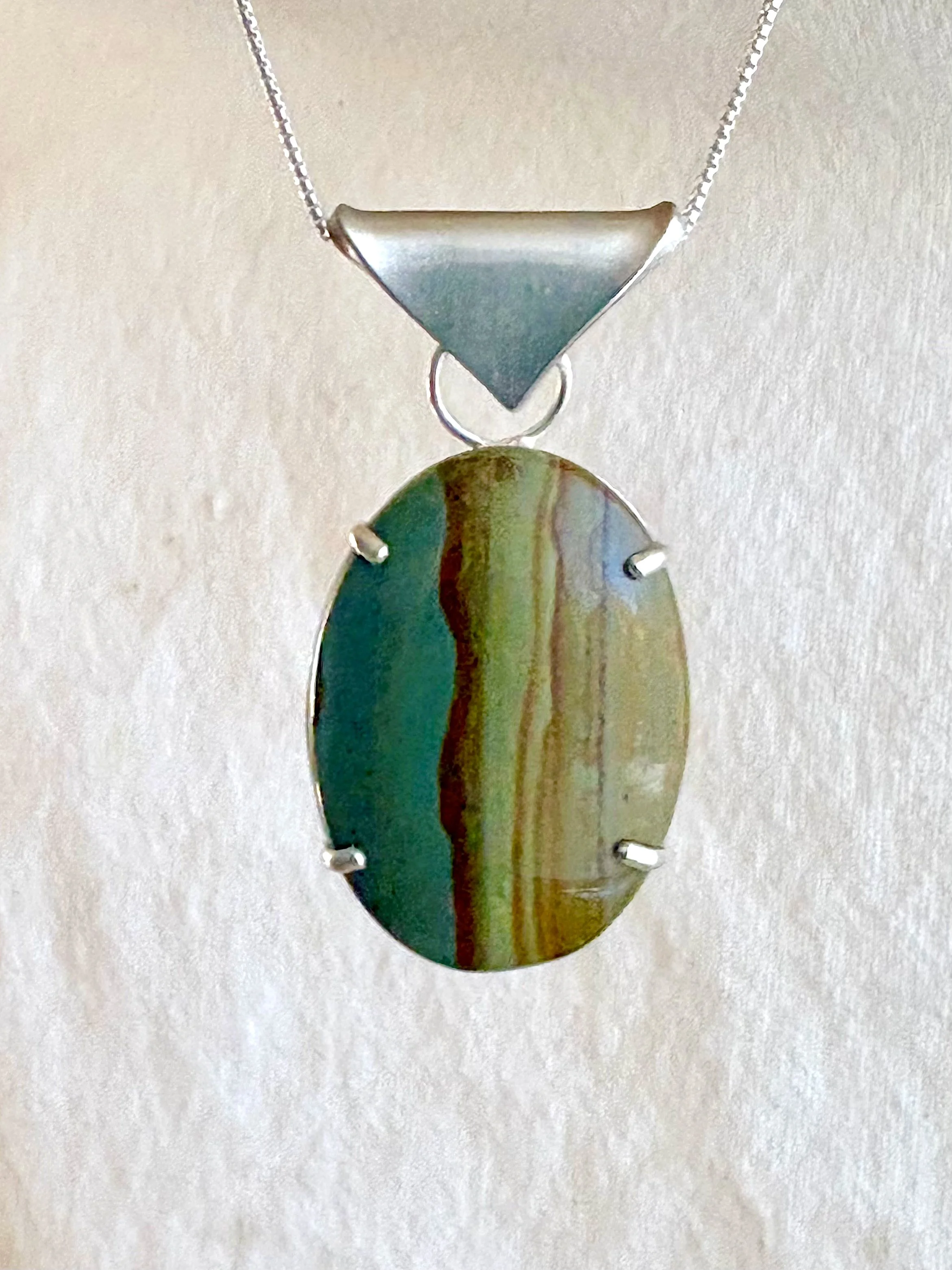 A recently commissioned creation from my jewelry bench features an oval, jasper cabochon. Tones of blue and green echo sea and land in this lovely earth stone. The frame and prong setting allow for maximum reveal of its subtle details and colors.