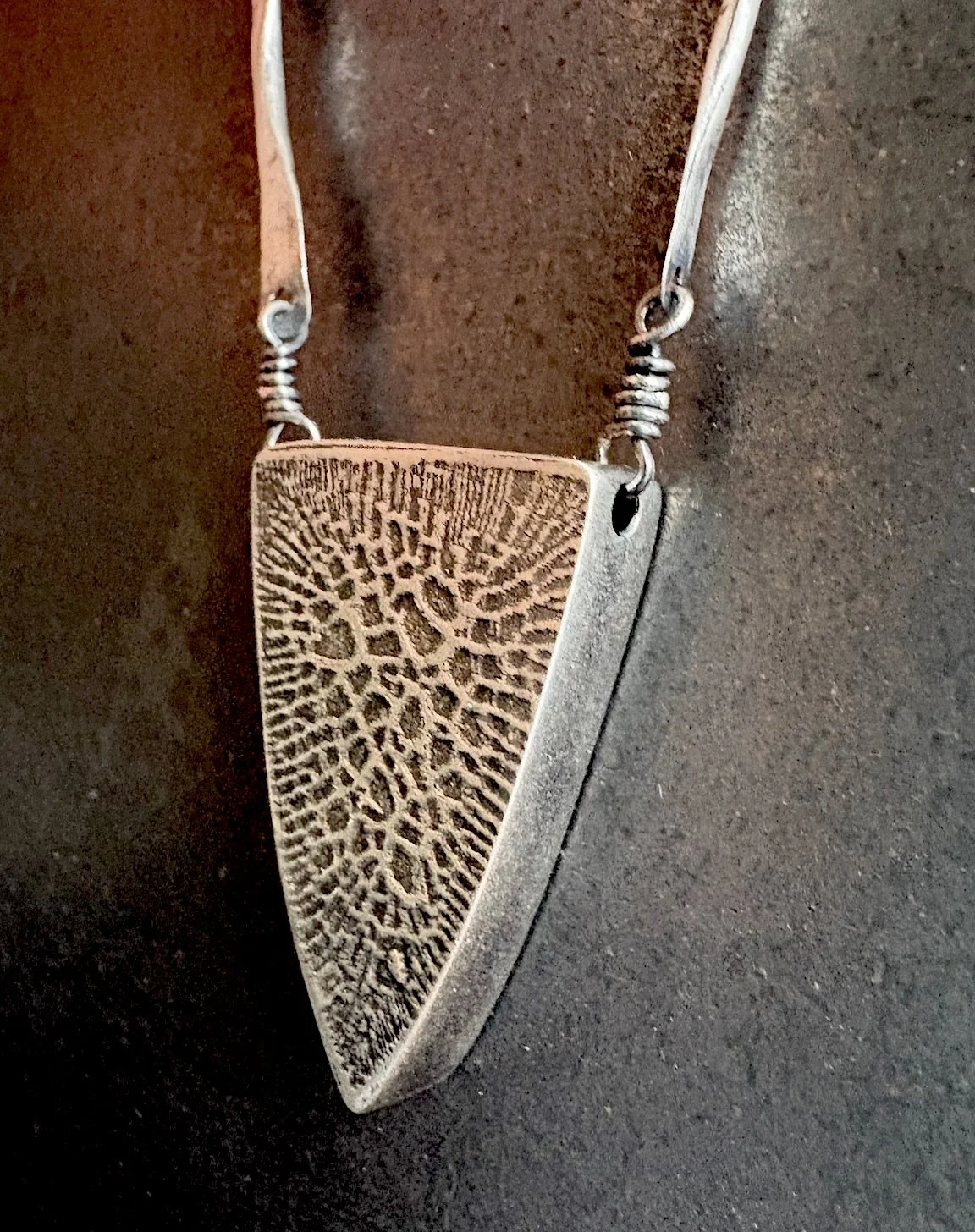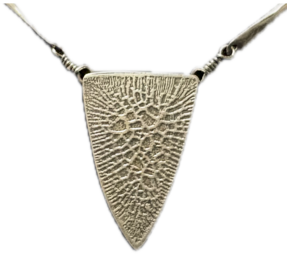 I enjoyed fabricating two versions of hollow form, textured, triangle pendant necklaces. One is 60’s inspired with beads, loops and links with twists of metal, holding it all together. The other more of a contemporary piece.